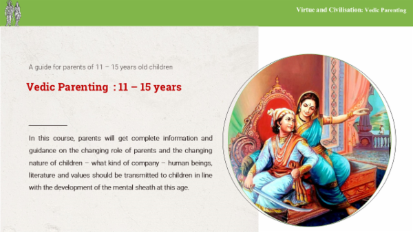 In this course, parents will get complete information and guidance on the changing role of parents and the changing nature of children. What kind of company - human beings, literature and values should be channeled to children in line with the development of the mental sheath (Manomaya Kosha) at this age.